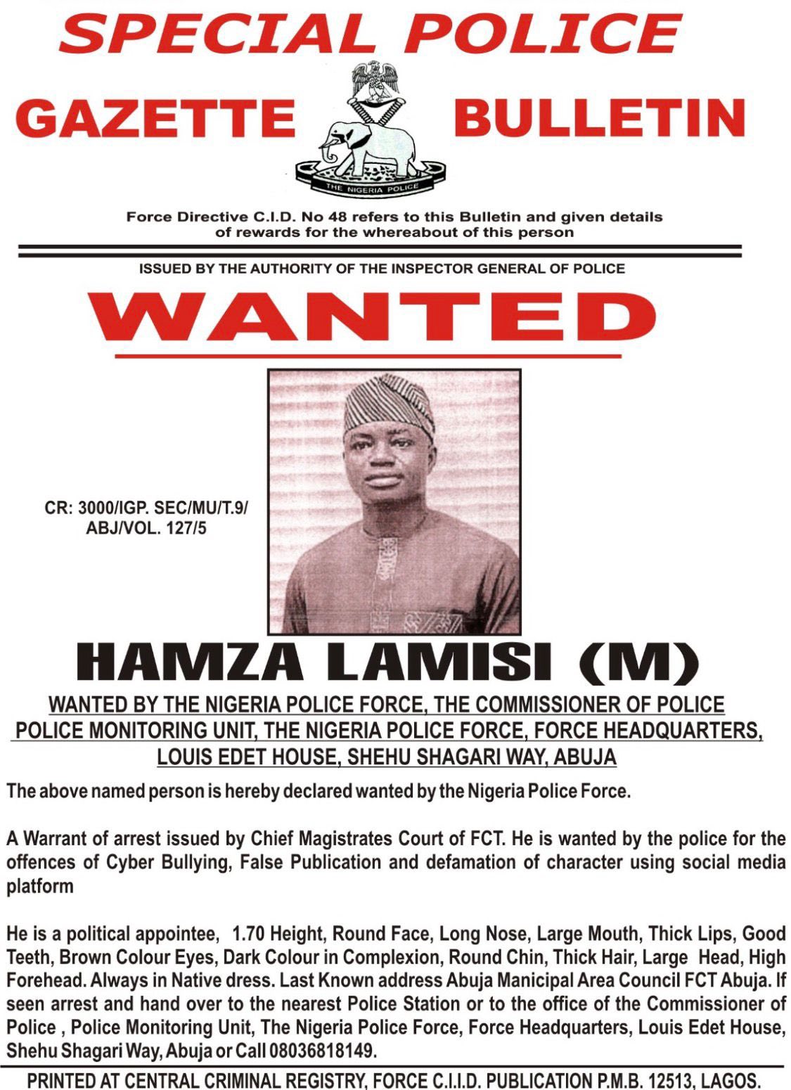 I wish to address the recent declaration of Mr. Hamza Lamisi as wanted by the Nigeria Police Force and to clarify critical developments surrounding this matter.